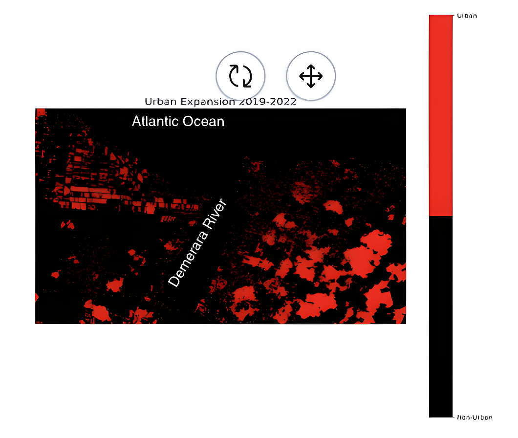 Georgetown expansion map showing red areas of new development - The red areas on this map indicate new urban development detected between 2019-2022, totaling 25.5 km². The concentration of red along the East Bank Demerara corridor illustrates the focused nature of Georgetown's expansion.