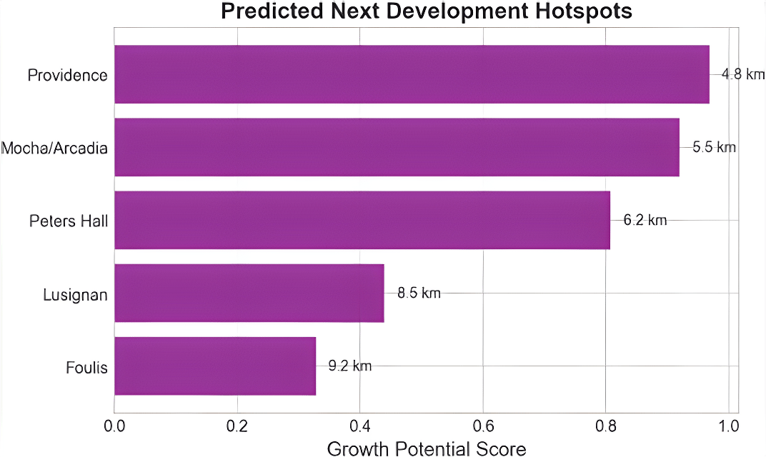 Figure 4: Bar chart showing growth zones and predictions - This chart displays the "Growth Potential Score" for five communities identified as likely areas for future development, with the purple bars representing the calculated score for each location. The scores highlight that Providence, Mocha/Arcadia, and Peters Hall have the highest potential for near-term growth, based on their proximity to the optimal development zones.