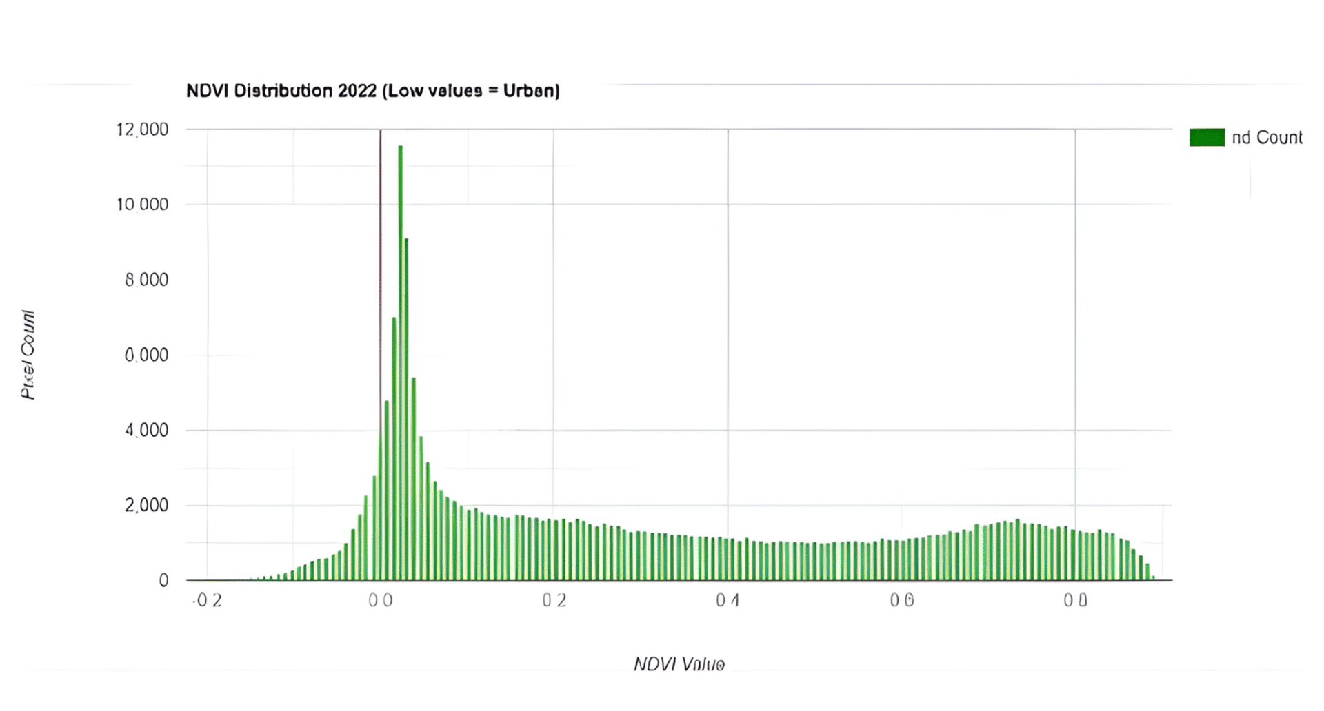 The chart shows a bimodal pattern. This NDVI (vegetation index) distribution chart reveals Georgetown's binary development pattern through satellite analysis. The left peak (0 to 0.2) represents built-urban areas, while the right peak (0.6 to 0.8) shows undeveloped land. The dramatic valley between peaks indicates minimal transitional or partially developed areas—land in Georgetown is either fully developed or awaiting development, with little in-between.¹