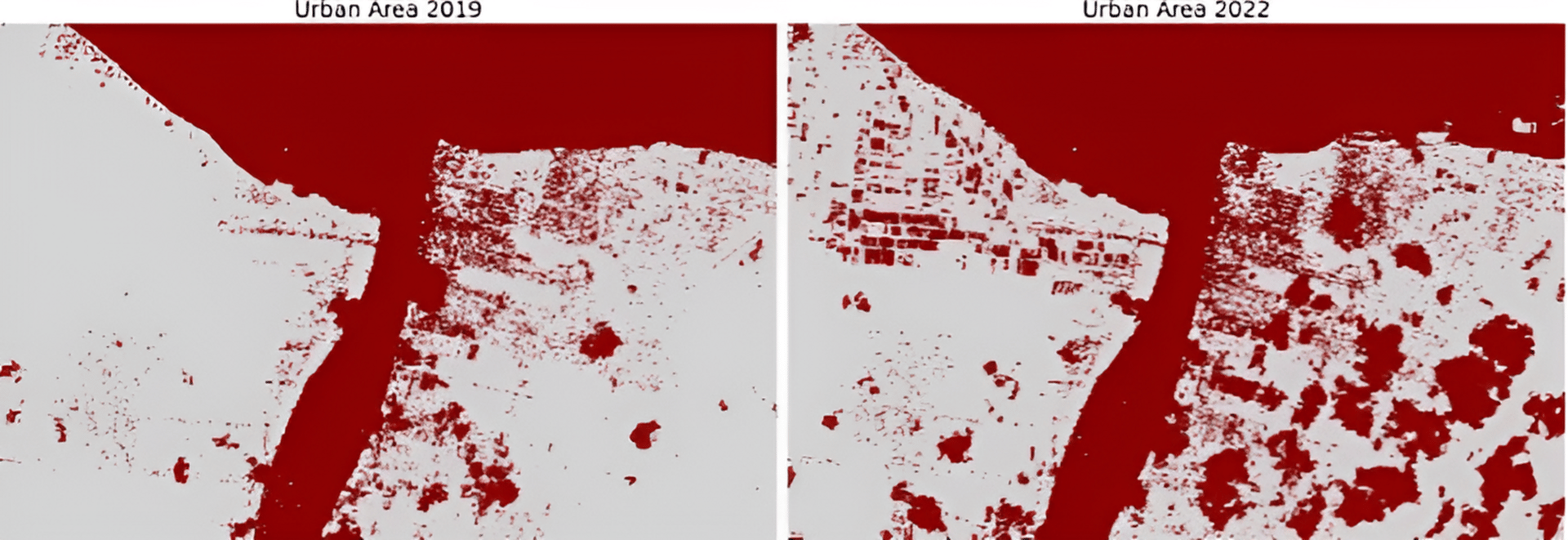 This satellite comparison shows Georgetown's dramatic transformation between 2019 (left) and 2022 (right). Dark areas indicate urban development, while the light areas represent vegetation and undeveloped areas. The images reveal how former undeveloped lands along the East Bank corridor have been converted to residential and commercial zones.